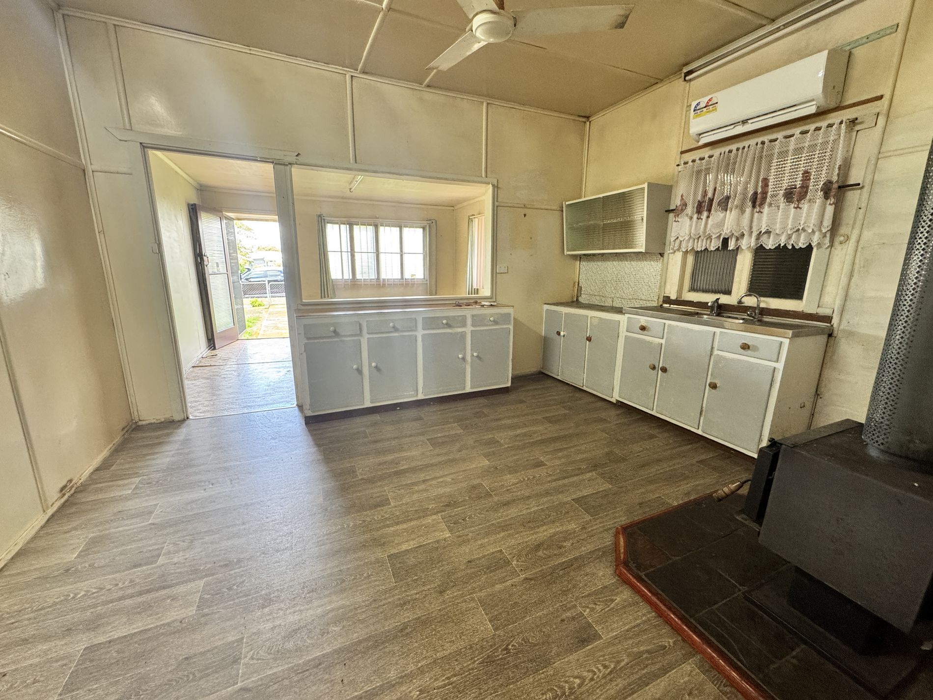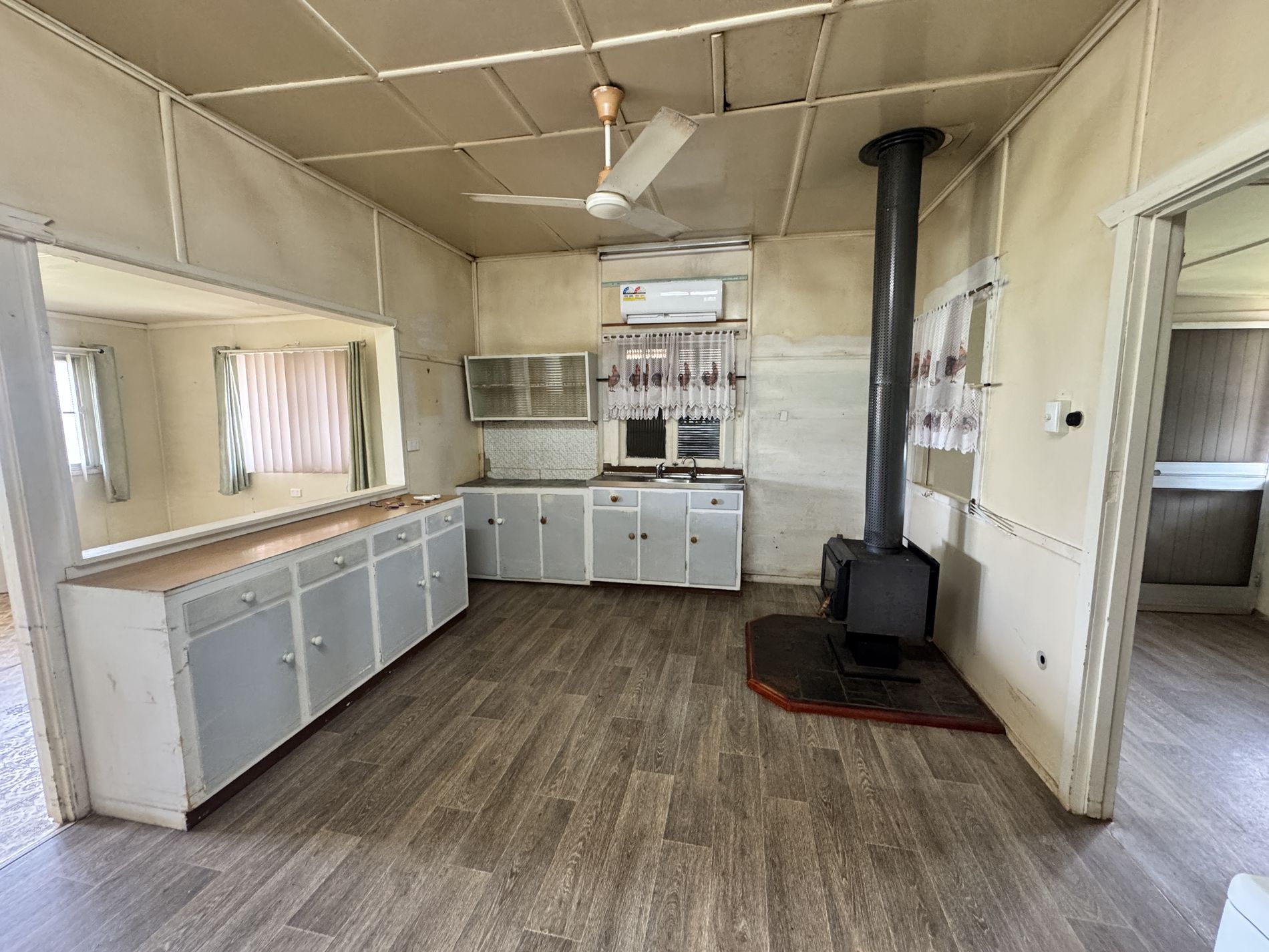 ⭐ Country Kitchen – Original cabinetry, freestanding wood heater, and plenty of storage.