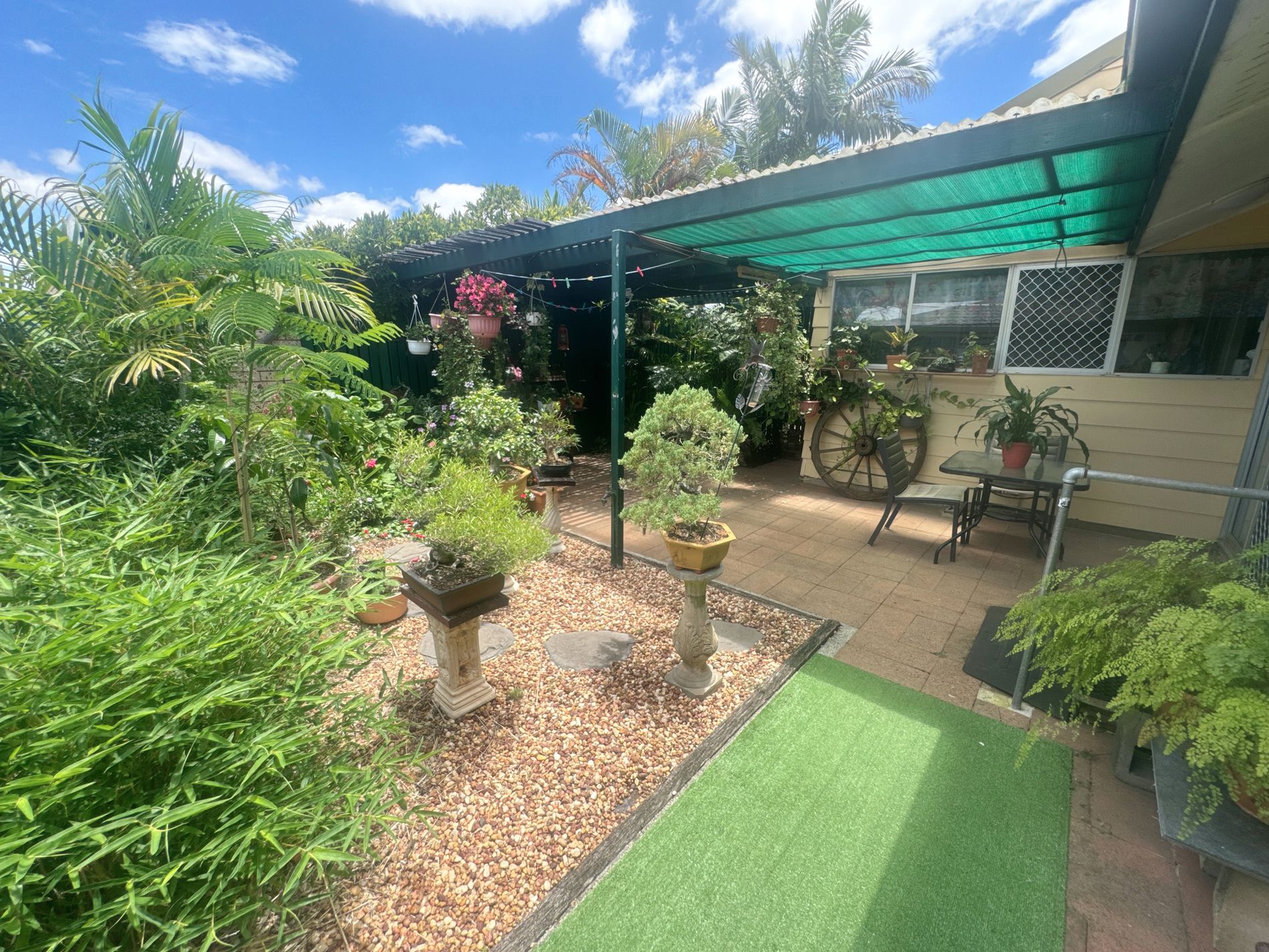 Step outside to discover a tranquil, private backyard framed by established gardens, and garden locker storage. A pergola-covered patio creates an inviting alfresco setting, complemented by beautifully curated greenery – perfect for relaxing, pottering or hosting guests.