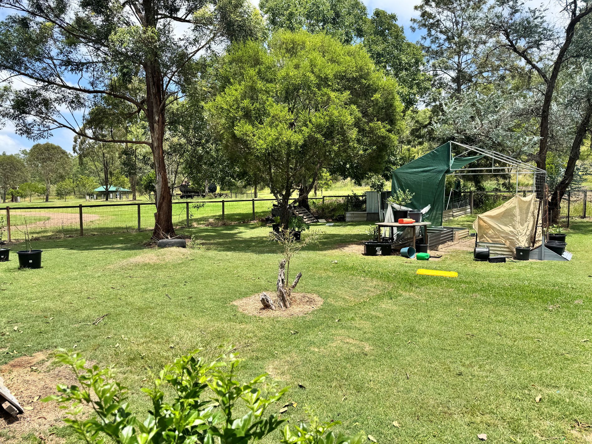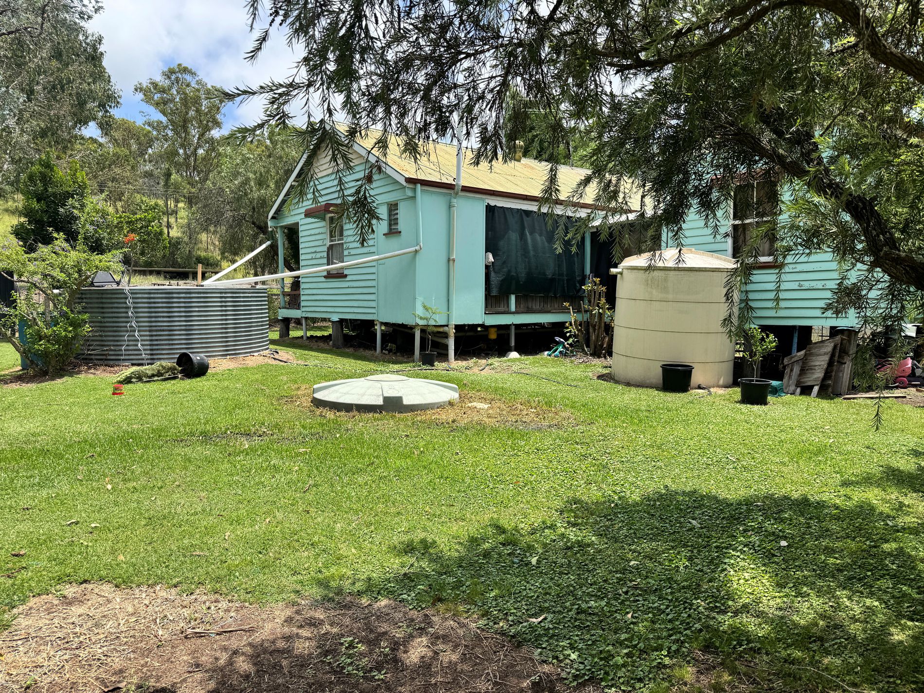 The yard includes water storage tanks, a fenced house yard, and plenty of usable space for those wanting a self-sufficient or lifestyle-oriented setup. A shaded outdoor sitting area provides the perfect spot to unwind and enjoy the peaceful surroundings.